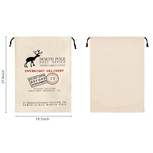 Especificaciones: HBlife 2 sacos de lona de Papá Noel, bolsas grandes de Papá Noel de 19.7 x 27.6 pulgadas para regalos, sacos de Navidad personalizados para regalos con cordón, paquete de 2 A