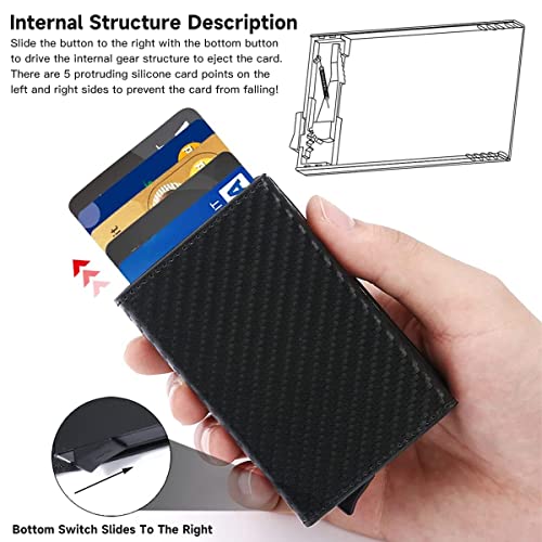 Diseño Emergente Automático: Hay un botón en la parte inferior. Presione el botón hacia abajo, y la tarjeta saldrá en pasos automática y sensiblemente, y elija la tarjeta que necesita fácilmente. Caja de metal para tarjetas con capacidad para 6-7 tarjetas.