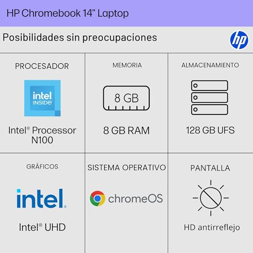 Especificaciones: HP Chromebook laptop de 14 pulgadas, pantalla HD, procesador Intel N100, 8 GB RAM, 128 GB UFS, Intel UHD Graphics, sistema operativo Chrome, gris pizarra, 14a-nf0099nr
