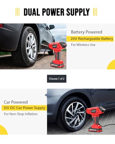 Fuente de alimentación dual para uso en cualquier momento: alimentado por una batería recargable de alta capacidad de 20V 4.0Ah o una toma de corriente de coche de 12V DC, este inflador funciona donde quiera que esté. Cambie al modo con cable cuando la batería se agote, sin tiempo de inactividad, sin límites. Ideal para emergencias, viajes y viajes largos por carretera.