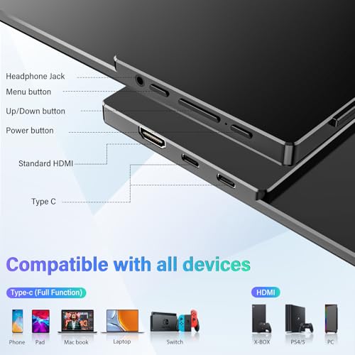 Amplia conectividad: el display de viaje proporciona 2 puertos tipo C con todas las funciones y 1 puerto HDMI estándar, lo que resulta en una mayor compatibilidad y durabilidad. Cambia fácilmente entre varios dispositivos, incluyendo pc, teléfono, tableta, PC, PS, Xbox o Transfer. Optimiza l. a. experiencia del usuario actualizando a una configuración de cuatro botones de acceso rápido para varias funciones, lo que facilita l. a. navegación del menú OSD