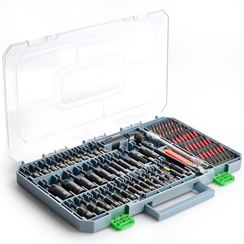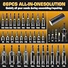 Especificaciones: Juego de 86 destornilladores de tuercas de impacto magnéticos, juego de brocas métricas y SAE con adaptadores de enchufe, soporte para brocas, destornillador de tuerca de ala, enchufes universales