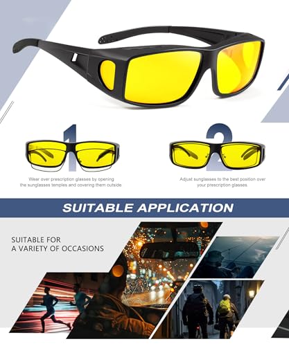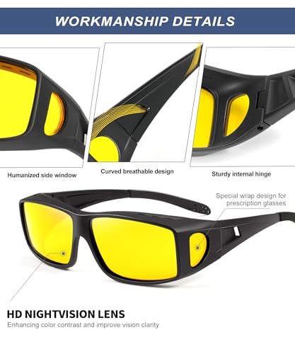 Especificaciones: KALIYADI Gafas de visión nocturna que se ajustan sobre las gafas envolventes: gafas de conducción nocturna antirreflejos para hombres y mujeres, lentes HD