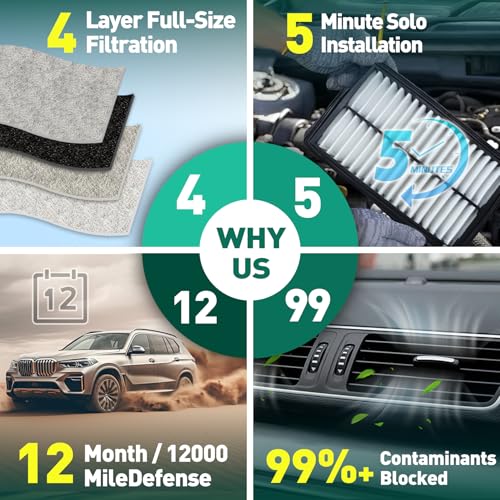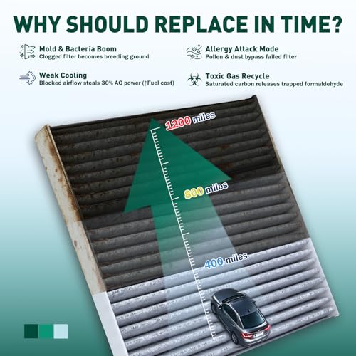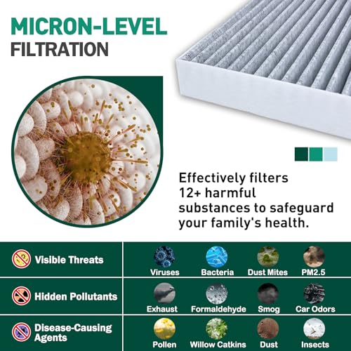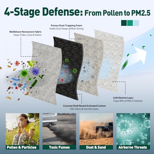 [Sistema de filtración de 4 etapas] Tecnología de filtro de aire de cabina multicapa: Pre-filtración → Eliminación de olores de carbón de coco dual → Captura electrostática de micropartículas → Capa de retención de alta capacidad de polvo para un aire de cabina más limpio.