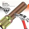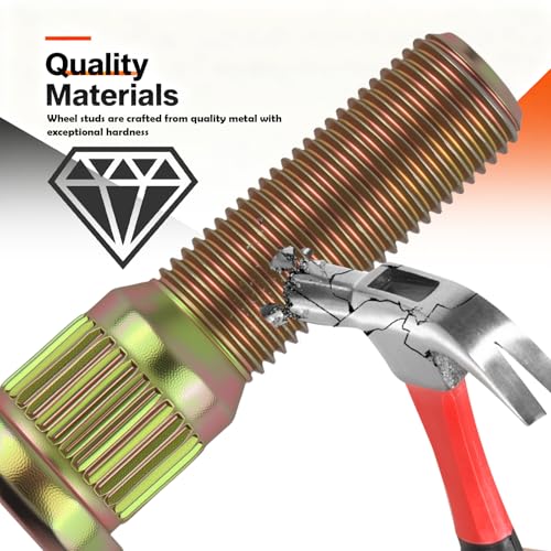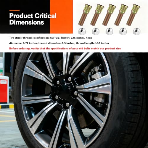 Dimensiones críticas del producto: especificación de rosca-rosca: 1/2 «-20, longitud: 0,62 pulgadas, diámetro: 0,9 pulgadas. Especificaciones de rosca de los pernos de neumático: 1/2»-20, longitud: 2.15 pulgadas, diámetro de la cabeza: 0.77 pulgadas, diámetro de rosca: 0.5 pulgadas, longitud de rosca: 1.30 pulgadas