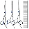 Tijeras profesionales para el aseo del perro: este kit de aseo para perros incluye 1 tijera de adelgazamiento, 1 tijera curva, 1 tijera recta y 1 peine para perros. Las tijeras profesionales de aseo para perros de 6.5 pulgadas son perfectas para principiantes y profesionales. Te permite, como peluquero, darle a tu compañero peludo un abrigo brillante y saludable. Suministros imprescindibles para el aseo de perros para nuevos propietarios