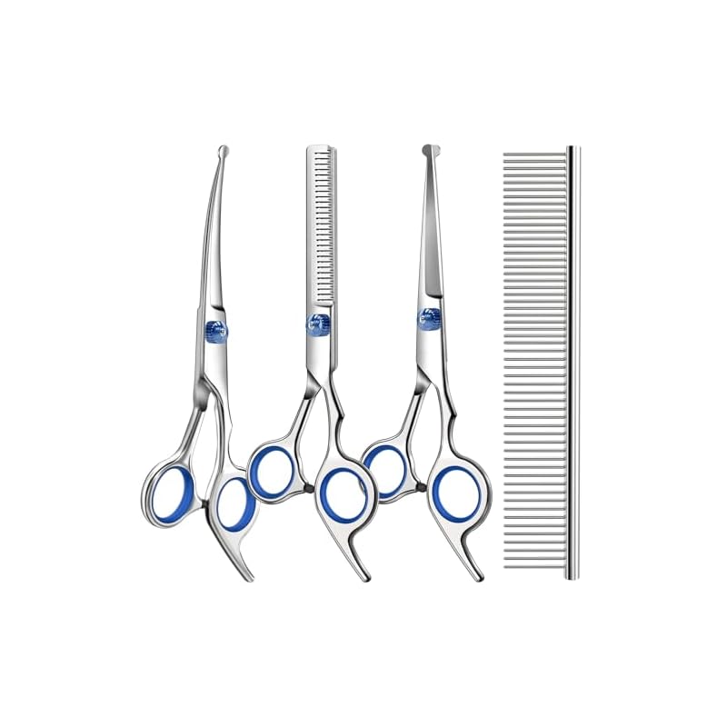 Kit profesional 4 en 1 de tijeras de aseo para perros y gatos con puntas redondas de seguridad, afiladas y duraderas, tijeras para perros para aseo – Incluye tijeras rectas y curvas, adelgazantes y