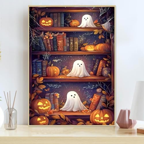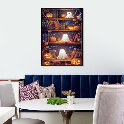 Lienzo de alta calidad: diseño espeluznante de estantería con kits de pintura de diamantes de fantasmas utiliza lienzo de impresión al óleo de alta claridad, caracteres claros, insípido, impermeable, respetuoso con el medio ambiente, colorido, haciendo que tu habitación sea más vivificante y brillante a la luz