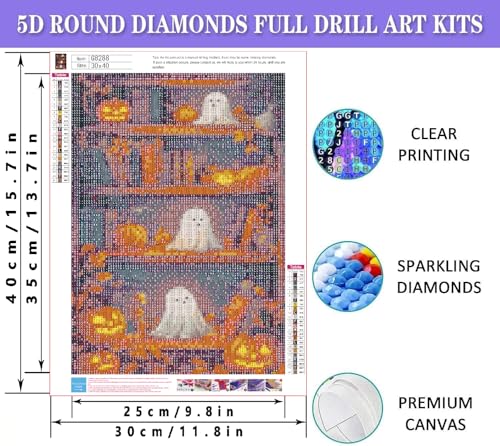 Especificaciones: Kits de pintura de diamantes de Halloween para adultos, diseño de estantería espeluznante con fantasmas kit de arte de diamantes para adultos principiantes, bricolaje de diamantes de taladro completo