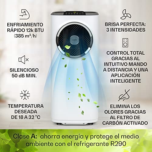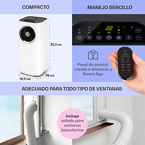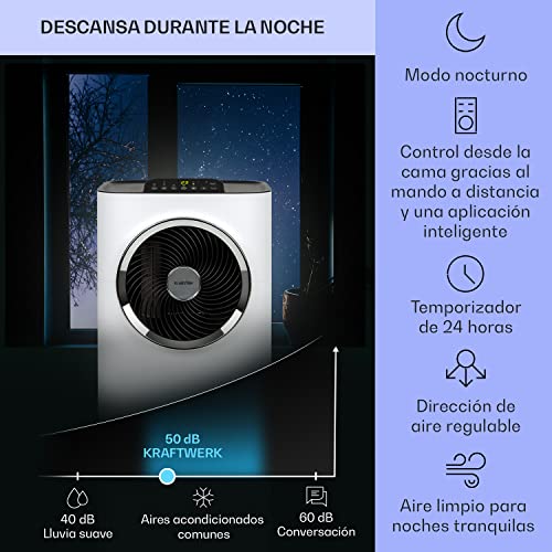 Especificaciones: Klarstein Aire Acondicionado Portatil Silencioso 5 en 1, Enfriador, Purificador Antibacteriano, Modo Nocturno y Deshumidificador, Elimina Olores, Control por App y Mando Distancia, 12,000 BTU, Blanco
