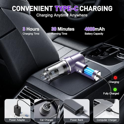 Carga rápida y segura tipo C: la aspiradora portátil para automóvil tiene una batería integrada de 4000 mAh con un puerto de carga tipo C, por lo que puedes cargar cómodamente la aspiradora en tu automóvil o en cualquier otro lugar. El tiempo de carga es de solo 2.5 horas y el tiempo de funcionamiento es de 20-30 minutos. Ahorra tiempo con esta aspiradora de mano inalámbrica para un uso a largo plazo y una limpieza eficiente