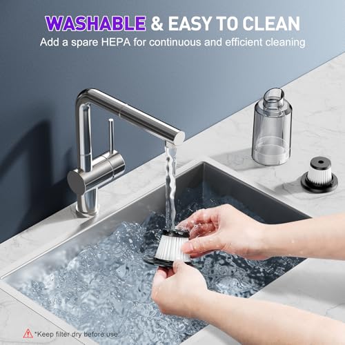 【Filtro HEPA y portátil】La aspiradora de mano está equipada con filtros HEPA lavables y reutilizables, que pueden filtrar eficazmente pequeñas partículas y polvo, asegurando una succión eficiente mientras mantiene el polvo y la suciedad fuera y evitan daños al motor. Además, esta mini aspiradora inalámbrica está diseñada para ser ligera y portátil, con un peso de solo 0.73 libras, por lo que se puede almacenar fácilmente sin ocupar demasiado espacio. El diseño inalámbrico permite una limpieza más flexible en casa o en el automóvil. Su portabilidad también lo hace ideal para viajes o actividades al aire libre