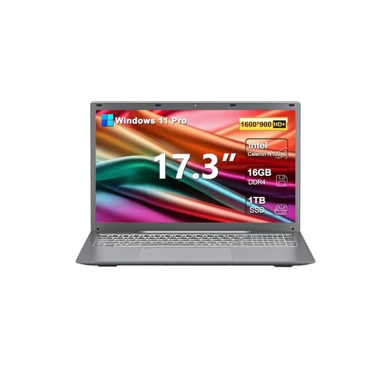 Especificaciones: Laptop 2025 17 17.3 pulgadas HD+ Windows 11 Pro para estudiantes y negocios, 16 GB DDR5 RAM, 1 TB SSD, Intel 4-Core N100 (hasta 3.4 GHz), teclado retroiluminado, huella digital, tipo C, con licencia