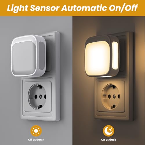 AUTO Sensor Luz: Esta luz nocturna tiene un sensor crepuscular, en modo automático, se encenderá automáticamente cuando el entorno sea lo suficientemente oscuro y se apagará automáticamente cuando el entorno sea lo suficientemente brillante.