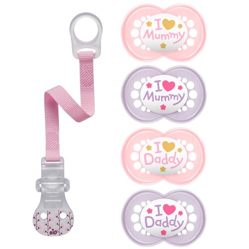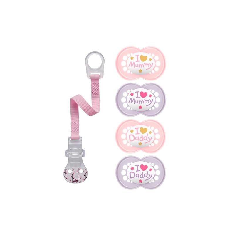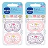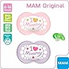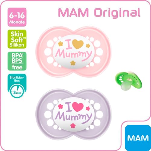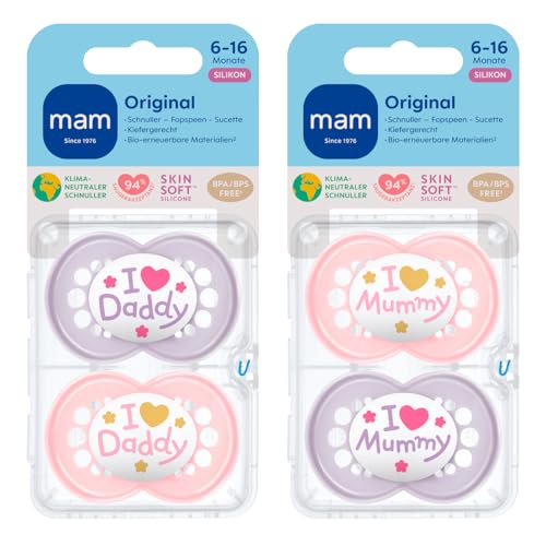 Juego de 4 chupetes MAM: 2 chupetes originales I love Mummy & 2 MAM Original I love Daddy. Tetina simétrica con silicona especial de seda – especialmente suave en la boca del bebé, incluye caja de transporte para esterilizar.