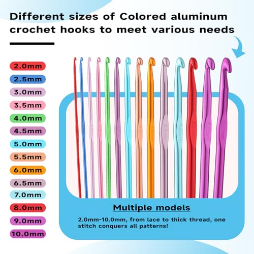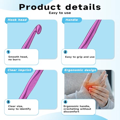 Fácil de usar: Los ganchos de ganchillo son de colores brillantes y tienen escalas de tamaño marcadas en el mango, lo que le permite distinguir fácilmente el tamaño del ganchillo, lo que le permite disfrutar fácilmente de su tiempo de ganchillo