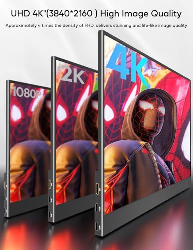 Monitor portátil 4K de 13.3 pulgadas: el monitor portátil KEEPTIME equipa una espectacular pantalla IPS A con resolución de 13.3 pulgadas, resolución de 3840 x 2160, brillo de 400 nits, relación de contraste 1500:1, 100% sRGB, ángulo de visión amplio de 178 grados y frecuencia de actualización de 60 Hz. Este monitor de viaje tiene funciones HDR, Low Blue Light y FreeSync. La pantalla externa mostrará un color nítido, una imagen vívida y detalles claros.