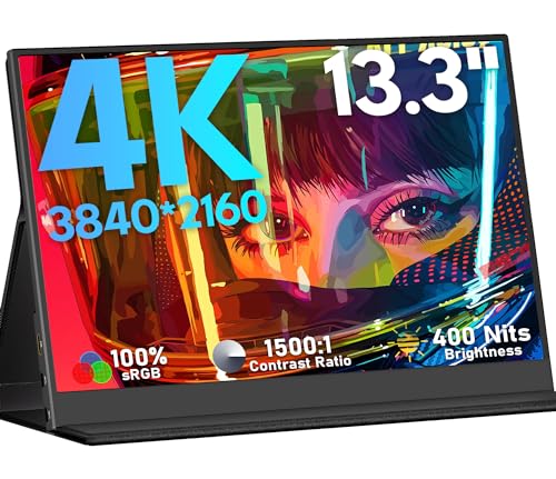 Monitor portátil 4K de 13.3 pulgadas 3840 x 2160 UHD USB-C HDMI, monitor para laptop, 100% sRGB IPS pantalla de juegos HDR monitor de viaje con altavoces para laptop, Xbox PS5, conmutador de PC y teléfono