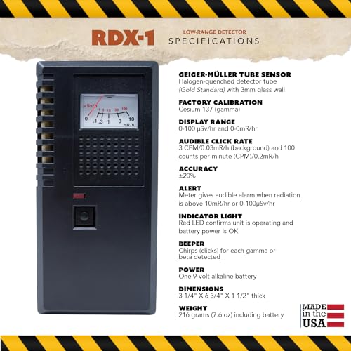 ¿Sabes si estás expuesto a los angeles radiación dañina? El medidor de radiación portátil de mano asequible RDX-1 es lo suficientemente pequeño como para ir a cualquier lugar y tan smart como los modelos profesionales de 1000 dólares, ya que RDX-1 detecta cantidades minúsculas de radiación gamma, beta y de rayos X. El tubo Geiger Muller de los angeles unidad detecta todos los isótopos gamma y beta liberados por las centrales nucleares, incluidos el yodo y el cesio. Los tubos GM son el método más deseable para detectar radiación. Es perfect para los angeles Seguridad Nacional y para detectar contaminación ambiental. Puede detectar los angeles radiación en el aire, los alimentos y el agua. Diseñado para personas no técnicas, el RDX-1 utiliza un detector de tubo Geiger Muller de 200 VCC muy smart, que ofrece una operación fácil con un solo botón. Sin retraso en los angeles detección, perfecto para barridos de exposición a los angeles radiación rápidamente. Responde rápidamente a los angeles exposición a los angeles radiación