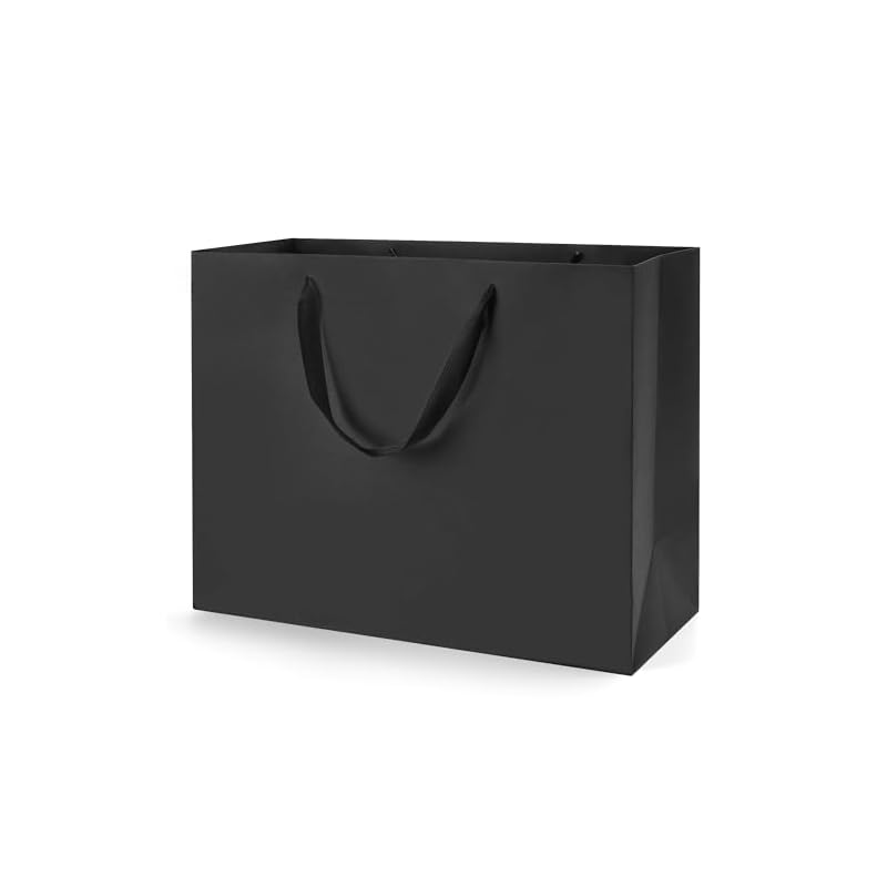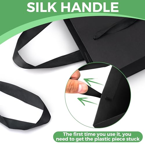 Cómodas asas de seda: Las asas anchas de seda proporcionan un agarre cómodo, mejorando la sensación lujosa de las bolsas de papel kraft negro. La apariencia elegante y elegante de las bolsas de papel negro añade un toque especial de sofisticación a tus regalos, haciendo que cada ocasión sea más memorable.