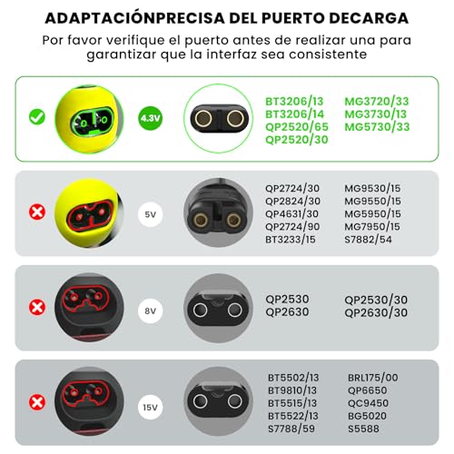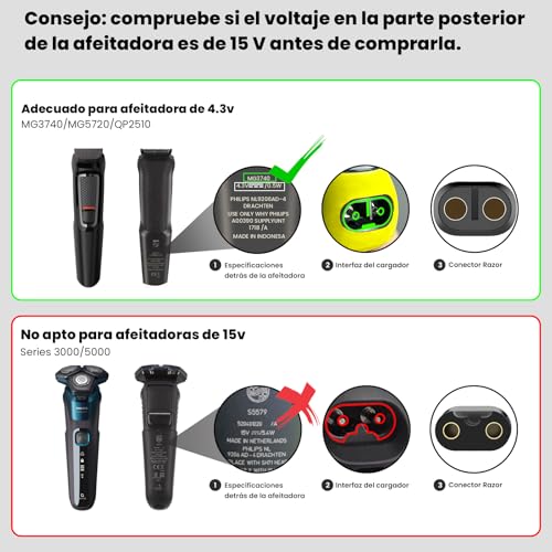 [Compra Correctamente] para Philips OneBlade tiene una variedad de voltajes de carga diferentes y puertos de carga de diferentes formas. Para no afectar su uso, confirme las especificaciones de voltaje de carga de su afeitadora y consulte nuestras imágenes antes de comprarla. Este producto solo es apto para OneBlade de 4,3 V