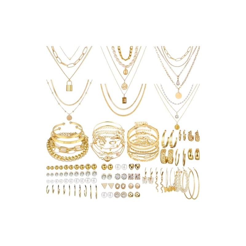 Especificaciones: NEWITIN Juego de 69 piezas de joyería de oro para mujer, joyería de disfraces de moda, collar chapado en oro, pulsera y aretes para mujer