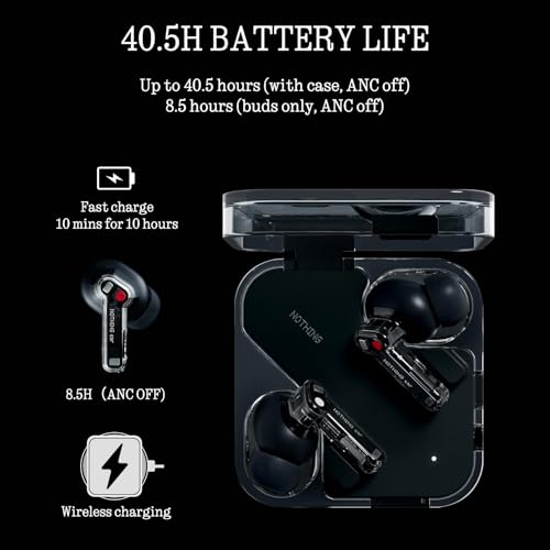 Tiempo de reproducción prolongado, carga rápida: el oído admite carga inalámbrica de hasta 2.5 W. Encienda sobre la marcha con carga inversa en dispositivos compatibles, como el teléfono (2). Alimentado para ir más lejos, el oído dura un 25% más que el Ear (2) con una sola carga. O recargar en el estuche y usar constantemente durante más de 40.5 horas (ANC apagado). Para encendedores rápidos, el oído puede cargar rápidamente durante 10 minutos y ofrecer 10 horas de reproducción (con ANC apagado)