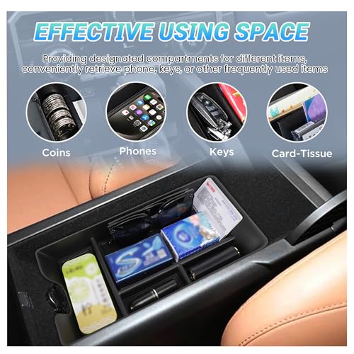 Diseño de zonificación multifuncional: nuestro organizador de caja de almacenamiento para reposabrazos está equipado con un soporte de gafas de sol dedicado para evitar apretar; divide el espacio del reposabrazos en dos capas para separar racionalmente los artículos y aprovechar al máximo el espacio