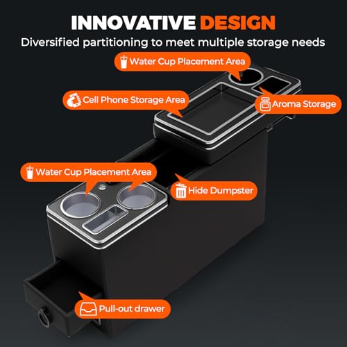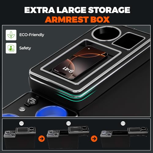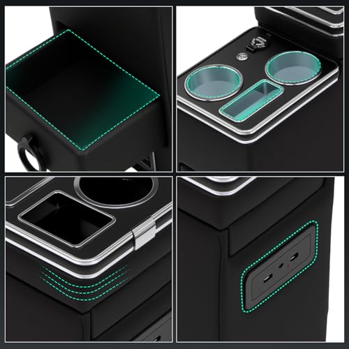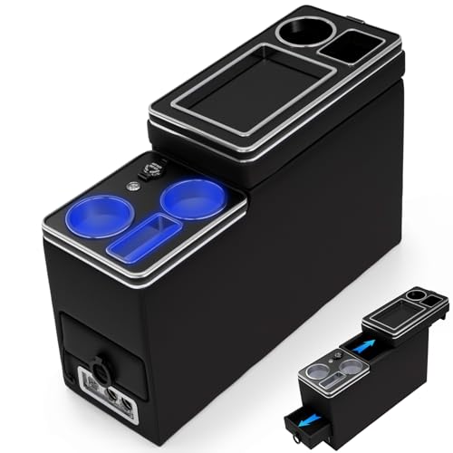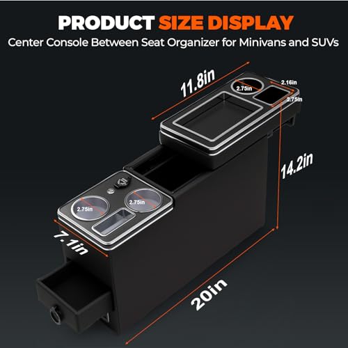 Especificaciones: Organizador de consola central entre asientos para minivans, SUV, con carga USB dual en la parte delantera y trasera, iluminación ambiental y cajones para minivan y SUV, caja de almacenamiento