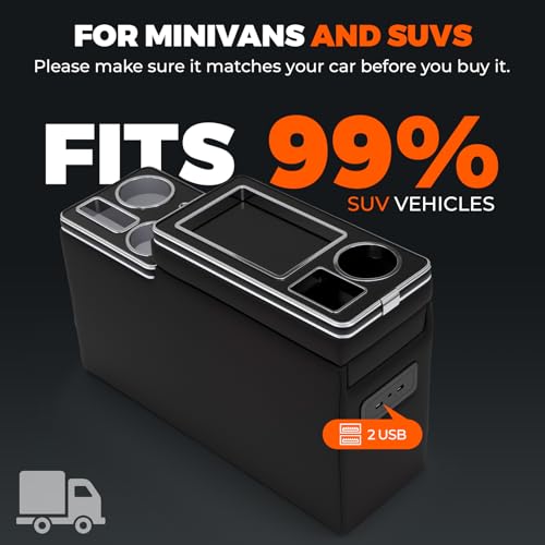 Organizador de consola central entre asientos para minivans, SUV, con carga USB dual en la parte delantera y trasera, iluminación ambiental y cajones para minivan y SUV, caja de almacenamiento