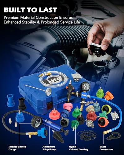 Construido para soportar el uso diario: construido con aleación de aluminio de calidad, nailon, caucho y latón, este kit de comprobador de presión del sistema de enfriamiento está diseñado para una mayor resistencia y un rendimiento constante durante años