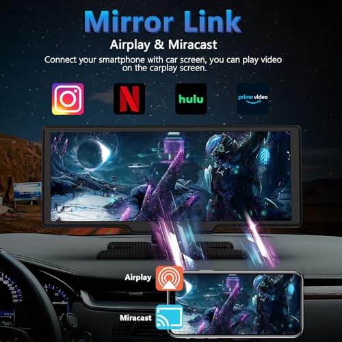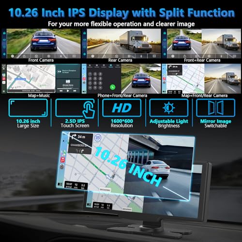 Pantalla Carplay inalámbrica portátil con cámara de salpicadero, tableta Lehwey de 10.26 pulgadas con cámara de tablero frontal 4K y cámara de respaldo de visión trasera de 1080P, Bluetooth 5.0, FM