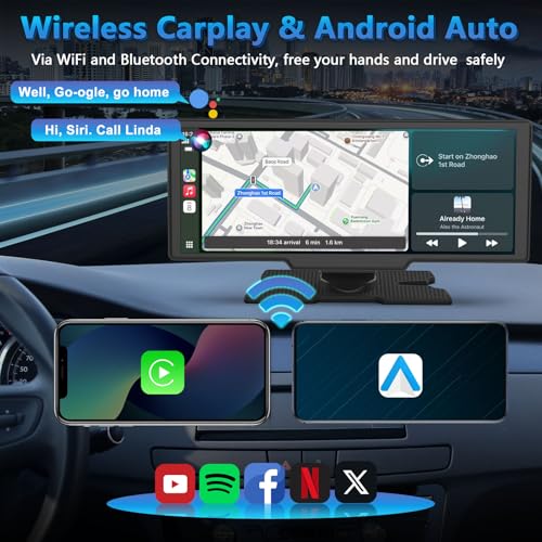【CarPlay inalámbrico y Android Auto】 Esta pantalla inalámbrica de Carplay es compatible con Carplay y Android Auto. Simplemente conecta tu teléfono inteligente a través de Bluetooth y WiFi para controlar el navegador satelital, mensajes, llamadas, música y más con tu voz. Mantén tus manos libres para una conducción completamente segura, sin retrasos ni retrasos. Además, la pantalla de reproducción del automóvil intentará conectarse automáticamente al último teléfono móvil conectado para evitar la molestia de conexiones repetidas para su conducción conveniente.