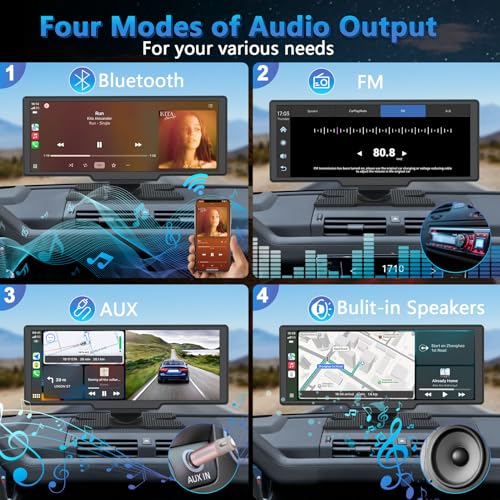 Múltiples salidas de audio: esta reproducción de automóvil Android cuenta con 4 modos de salida de audio para automóvil (Bluetooth 5.0 + radio FM + interfaz de audio + altavoces integrados). Con receptores estéreo para automóvil, esta pantalla inalámbrica para automóvil permite llamadas manos libres de alta calidad y reproducción de música inalámbrica. El cable de entrada AUX le permite transmitir música desde su teléfono al carplay portátil. Los altavoces integrados ofrecen una reproducción de sonido auténtica de alta fidelidad y cuentan con un control de volumen flexible y fácil.