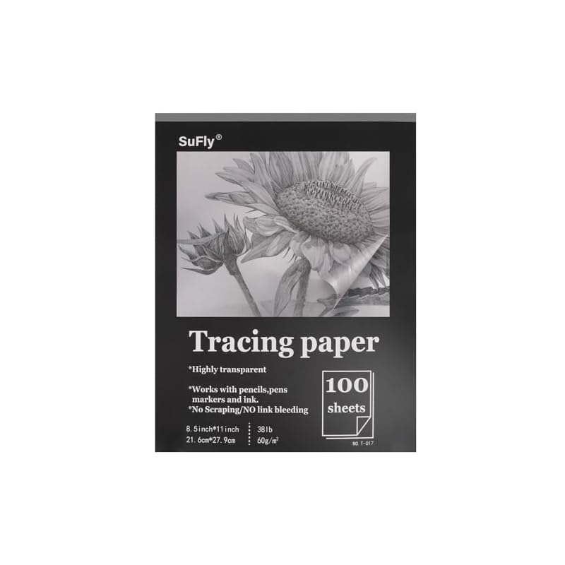 Especificaciones: Papel de calco de 8.5 x 11 pulgadas, 100 hojas de papel vitela transparente para blocs de trazado, papel de calco translúcido de 38 libras/2.12 oz/m² para lápiz, marcador y tinta, imágenes de traza