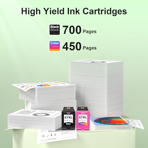 Cartucho de tinta 67 XL de alto rendimiento para impresoras HP: 700 páginas compatibles para cartuchos de tinta negra HP 67 y 450 páginas compatibles con cartuchos de tinta de color hp 67 (con cobertura estándar del 5%), reduciendo la molestia de cambios frecuentes de cartuchos de tinta y especialmente adecuado para usuarios con impresión de alto volumen.