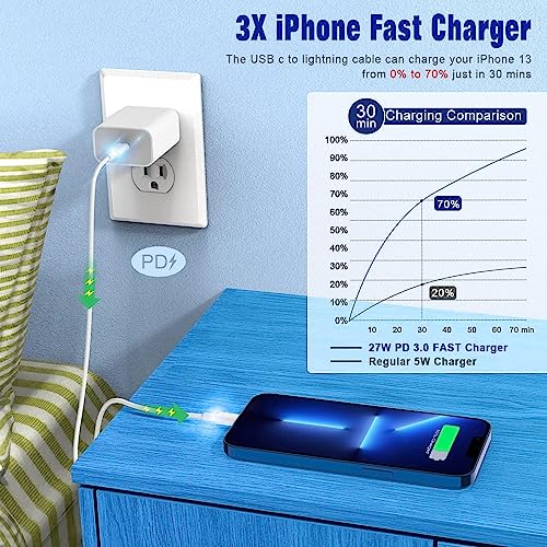 Carga y sincronización rápidas: el cable USB-C a Lightning soporta entrega de energía de alta velocidad de carga rápida, puede cargar el iPhone 13 hasta un 50% en 30 minutos. También admiten una velocidad de transferencia de datos de hasta 480 Mbps, que puede transferir fácilmente música, fotos y archivos entre iPhone y computadora portátil o computadora de escritorio en segundos. (Nota: necesitas utilizar un adaptador de alimentación USB-C de 20 W o superior para lograr la carga rápida de entrega de energía)