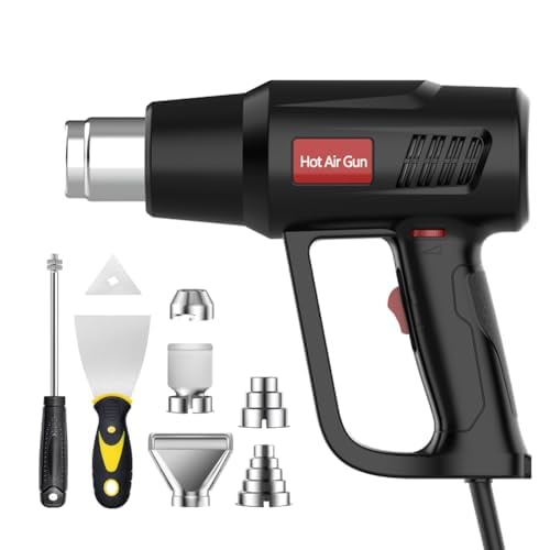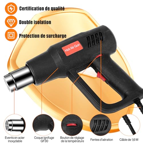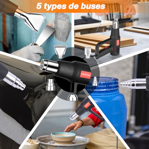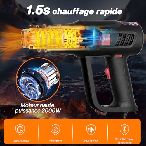 Pistola de Calor de 2000 W, Pistola de Aire Caliente con Temperatura Ajustable de 50 ℃ a 650 ℃, 2 Volúmenes de Aire, Adecuada para Eliminar óxido y Descongelar, 8 Accesorios