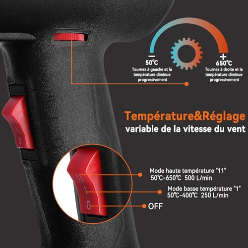 【Ajuste de temperatura continuo de dos velocidades】Nuestra Pistola de Calor está equipada con un interruptor de volumen de aire y un botón de control de temperatura continuo, que puede calentarse rápidamente en 1,5 S. Modo de viento bajo «I»: volumen de aire 250 L/MIN, temperatura. rango 50-400°C. Modo de viento fuerte II: volumen de aire 500 L/MIN, rango de temperatura 50-650 ℃. Cuando lo use, use el botón de control de la pistola de calor para ajustar la temperatura de acuerdo con el contenido del trabajo.