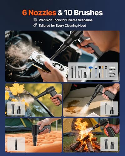 6 boquillas versátiles y 10 cepillos de detalle: ofrece soluciones personalizadas para cada tarea de limpieza, desde delicados teclados de computadora y electrónica sensible hasta detalles del automóvil, limpieza profunda del hogar e incluso tareas de inflado al aire libre. Una herramienta, dominio infinito.