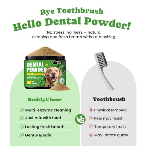 Elimina el mal aliento: di adiós al apestoso aliento del perro. Este polvo dental para perros con té verde y menta funciona como un ambientador de aliento de perro, polvo de limpieza de dientes de perro y polvo dental para dientes de perro. Utilízalo con el cepillo de dientes de tu perro y pasta de dientes o kit de cepillado de dientes de perro como un removedor de sarro para los dientes y un palillo de polvo para perros de confianza para una mascota verdaderamente fresca.