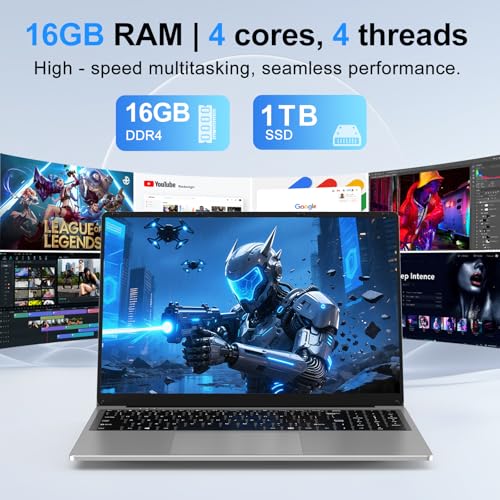 Portátil para juegos, computadora portátil 2025 de 16 pulgadas, procesador N150 (4C/4T, hasta 3.6 GHz), 16 GB de RAM 1 TB SSD, WiFi 5, BT4.2, FHD de 16 pulgadas 1920 x 1200 (16:10), teclado