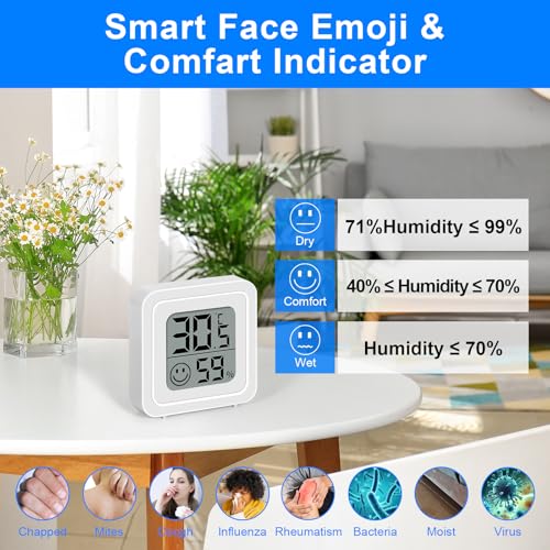 【Alta precisión】: El termometro digital casa de la habitación tiene un rango de – 20 ° C a 60 ° C y una desviación de ± 1 ° c. la humedad se muestra entre el 10% y el 99% RH (+ 5%) y se muestra intuitivamente a través de símbolos faciales. debido a los sensores sensibles incorporados, la lectura se actualiza automáticamente cada 10 segundos.