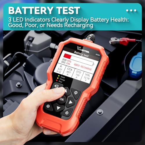 Diagnóstico de batería profesional: El probador de batería BT500 es una solución de diagnóstico todo en uno, diseñada para una amplia compatibilidad. Prueba con precisión baterías de 6V, 12V y 24V, suitable con baterías inundadas, AGM de placa plana, AGM en espiral, GEL y EFB. Ya sea que esté revisando un automóvil antes de un viaje prolongado o una batería de camión en un lugar de trabajo, este probador de batería automático proporciona datos confiables sobre voltaje, resistencia, estado de salud (SOH) y estado de carga (SOC). No disponible para baterías de litio o carrito de golfing