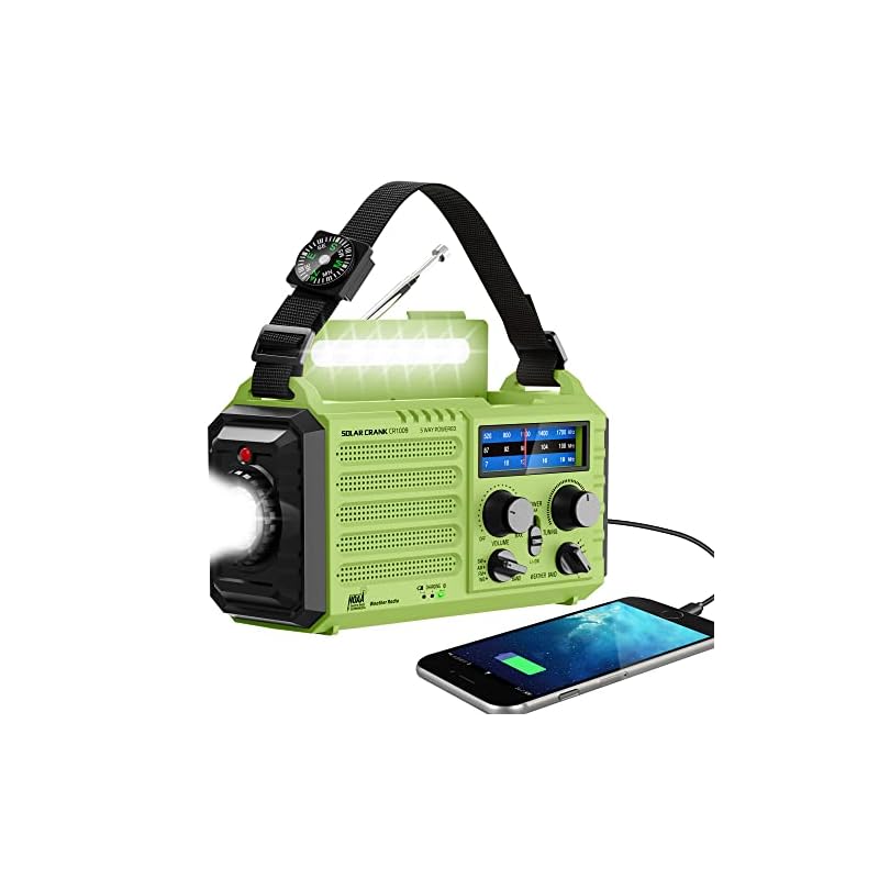 Especificaciones: Radio meteorológica NOAA, radio de manivela de emergencia con cargador solar, radio portátil de onda corta AM FM con linterna LED, cargador USB, conector de auriculares, alerta SOS para huracán de
