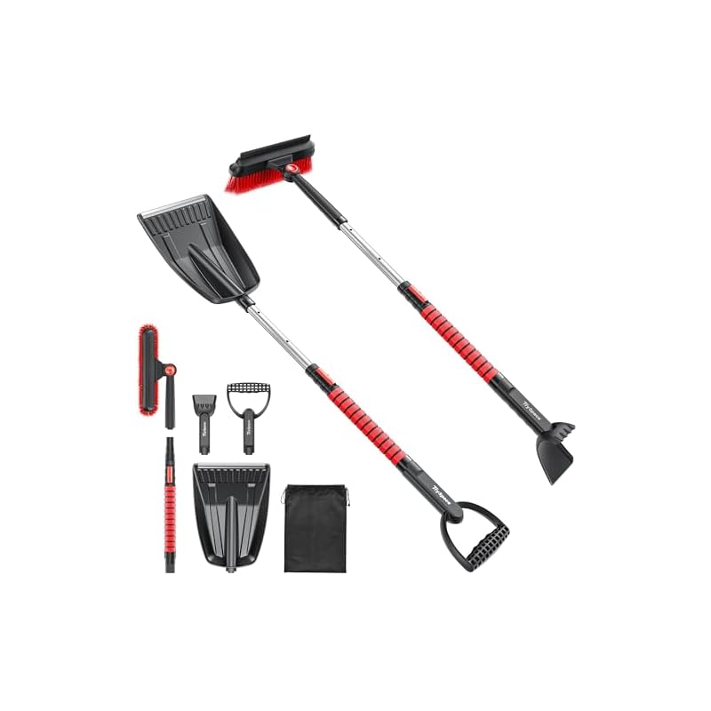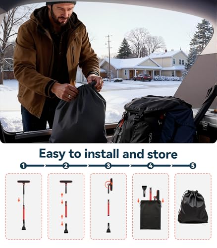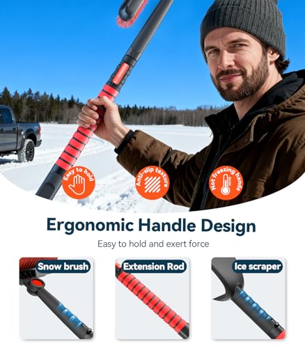 Diseño de mango ergonómico: ① El poste telescópico de aluminio multiajustable se extiende hasta 47 pulgadas, lo que hace que las áreas difíciles de alcanzar (como techos de SUV o camionetas) sean fáciles de limpiar sin pararse de puntillas. ② Cómodo agarre de esponja que se adapta perfectamente a tu palma, antideslizante y resistente a las heladas, no más manos frías y resbaladizas. ③ Tanto el cepillo de mango corto como el raspador de hielo independiente cuentan con agarres en forma de mano para facilitar la sujeción y ejercer fuerza, aumentando significativamente tu eficiencia.