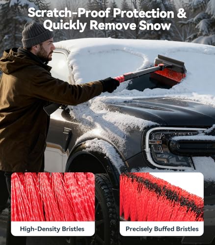 Cabezal de cepillo de alta eficiencia sin arañazos: el cepillo denso y grueso limpia rápidamente la nieve. Equipado con cerdas de nailon suave de alta densidad con puntas suavizadas y curvas, lo que garantiza cero riesgo de arañazos en la pintura del automóvil o el vidrio. Cabezal de cepillo más ancho + diseño giratorio de 360° que significa un área más grande de barrido único y sin ángulos muertos para la eliminación de nieve multiángulo, deshacerse de la nieve del techo/ventana en poco tiempo.