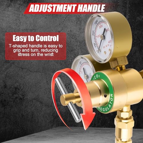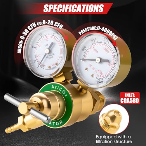 Especificaciones: La pantalla reguladora CGA580 de doble calibre de alta precisión es fácil de leer y precisa, rango de presión de entrada: 0-4000 PSI, rango de presión de salida de argón: 0-30 CFH, rango de presión de salida de CO2: 0-20 CFH