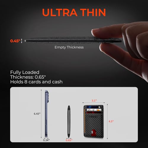 Elegantemente pequeña, delgada y discreta: mide solo 3 1/8″ x 4 7/16″ x 1/9″, nuestra cartera delgada de bolsillo frontal RFID es súper delgada y modernamente delgada. Es la cartera minimalista que cabe perfectamente en tu bolsillo, bolso o mochila de viaje.