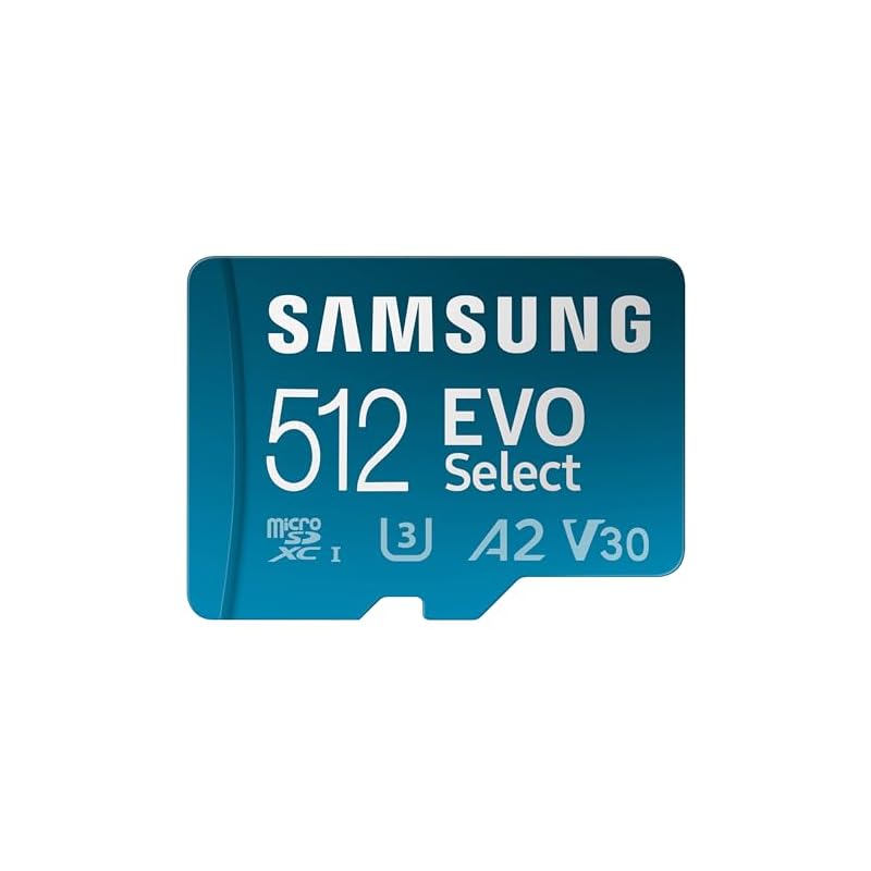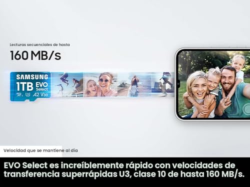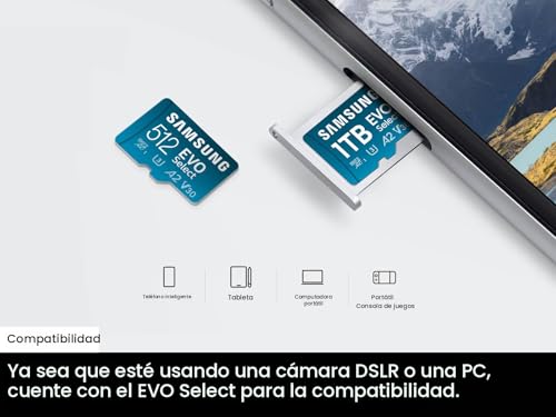 Especificaciones: Samsung EVO Select – Tarjeta de memoria microSD + adaptador, microSDXC de 512 GB, hasta 160 Mbps, 4K UHD, UHS-I, C10, U3, V30, A2, celulares inteligentes, Nintendo Switch y tabletas (MB-ME512SA/AM)